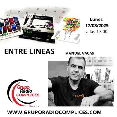 Radio Complices ha dedicado a través de su programa «ENTRE LINEAS»», de FERNANDO Rc, una entrevista a Manuel Vacas el 21 de marzo de 2025. Durante la entrevista, se habló de la actividad artística del autor, su trayectoria profesional y su proyectos futuros- También se comentaron las actividades que como componente de Trazo6, desarrolla junto a otros artistas. Entrevista a Manuel Vacas 21/03/2025