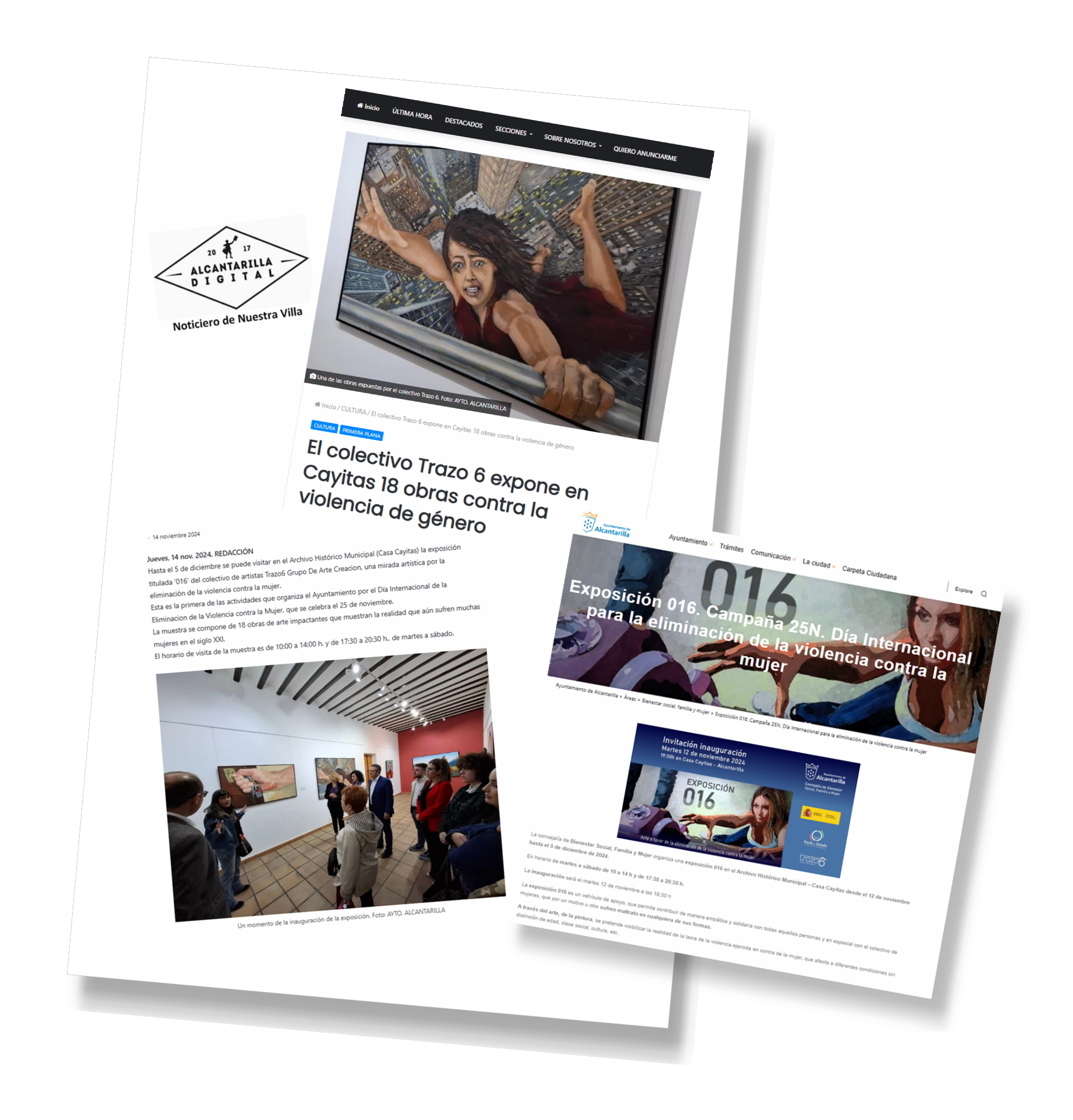 Organizado por el Ayuntamiento de Alcantarilla, la exposición 016 podrá ser vista desde el 12 de noviembre hasta el 5 de diciembre de 2024. Un total de 18 obras, una más de las que habitualmente la componen, completando las 3 salas de exposiciones de Casa Cayitas, edificio del Archivo Municipal de Alcantarilla. La exposición está promovida por la Concejalía de Bienestar Social, Familia y Mujer que ha sido la encargada de la gestión llevada a cabo para que 016 pueda ser vista en esta localidad. Está previsto por la misma concejalía, según palabras de Raquel de la Paz, que se organicen eventos y visitas guiadas de diversos colectivos sociales así como colegios e institutos, en torno a los eventos de concienciación sobre el tema de la violencia de género que se llevan a cabo en el municipio durante estos días.,