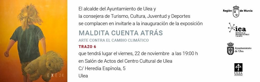 Te invitamos a sumergirte en un mundo de colores y emociones que te harán reflexionar sobre el futuro de nuestro planeta. La exposición "Maldita cuenta atrás" llega al Ayuntamiento de Ulea para mostrarte, a través de la mirada de talentosos artistas, los desafíos que plantea el cambio climático. Del 22 de noviembre al 22 de diciembre de 2024, podrás admirar obras que plasman la urgencia de actuar ante esta crisis global. Cada pincelada te transportará a paisajes devastados, ecosistemas en peligro y un futuro incierto. No te pierdas esta oportunidad de concienciarte y unirte a la lucha contra el cambio climático. ¡Te esperamos!