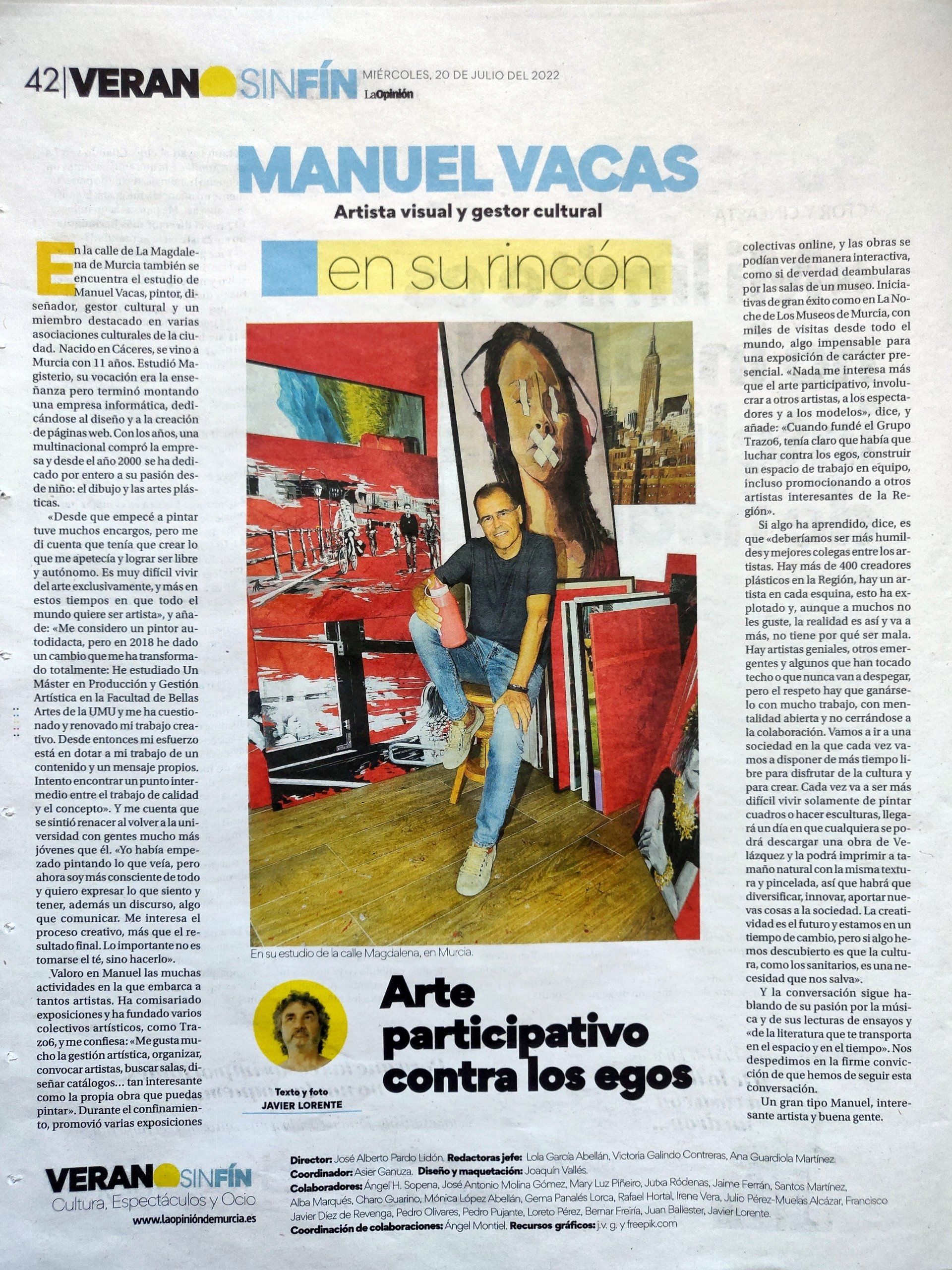 La Opinión de Murcia, 20/07/2022, Veranos sin fin - En su rincón - Manuel Vacas - El arte participativo contra los egos - Entrevista y foto de Javier Lorente.