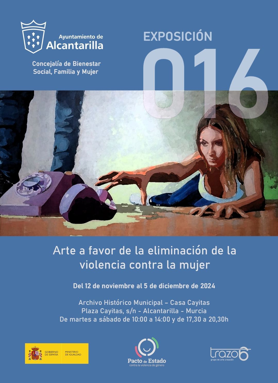 Organizado por el Ayuntamiento de Alcantarilla, la exposición 016 podrá ser vista desde el 12 de noviembre hasta el 5 de diciembre de 2024. Un total de 18 obras, una más de las que habitualmente la componen, completando las 3 salas de exposiciones de Casa Cayitas, edificio del Archivo Municipal de Alcantarilla. La exposición está promovida por la Concejalía de Bienestar Social, Familia y Mujer que ha sido la encargada de la gestión llevada a cabo para que 016 pueda ser vista en esta localidad. Está previsto por la misma concejalía, según palabras de Raquel de la Paz, que se organicen eventos y visitas guiadas de diversos colectivos sociales así como colegios e institutos, en torno a los eventos de concienciación sobre el tema de la violencia de género que se llevan a cabo en el municipio durante estos días.,
