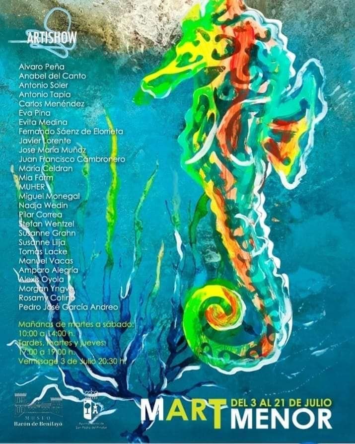 ArtiShow inaugura la exposición colectiva Mart Menor en el Museo Barón de Benifayó en San Pedro del Pinatar de Murcia, donde principalmente artistas españoles, suecos, así como de otras nacionalidades muestran sus obras desde el 3 al 21 de julio de 2023 en el Museo Barón de Benifayó.