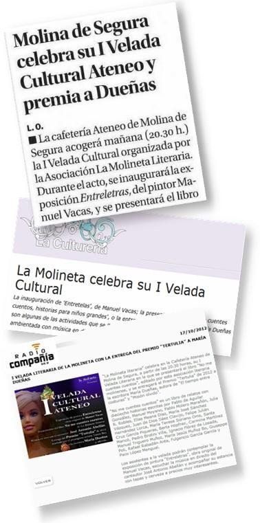 El grupo La Molineta Literaria organizó el 17 de octubre de 2012 su I Velada Cultural Ateneo. Un evento multicultural donde pintura, literatura, música y gastronomía se daban cita en la sala Ateneo de Molina de Segura. Manuel Vacas fue el pintor invitado y presentó la exposición "Entreletras" su primera exposición retrospectiva después de 10 años de exposiciones. En ella se pudieron ver obras desde 2002 hasta 2012 con la inclusión de algunas obras inéditas. En dicho evento se presentaba el libro "No me cuentes cuentos" del grupo de la Molineta así como música en directo por el cantautor "José Antonio Abellán" y degustar tapas literarias por "El obrador de Delia". El premio "Tertulia" inaugurado en esta velada, recayó sobre la entrañable escritora "María Dueñas" que firmó gran número de sus obras.